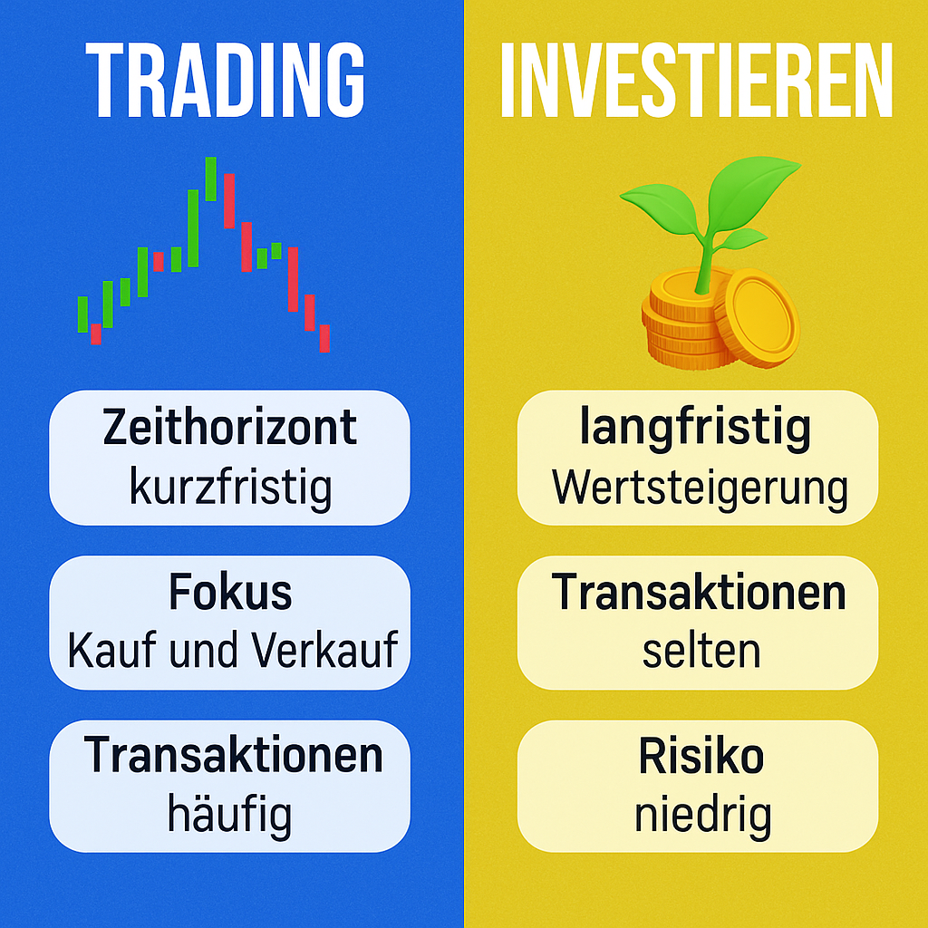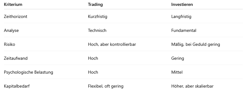 Tipp: Viele erfolgreiche Marktteilnehmer nutzen beide Ansätze: Sie investieren langfristig für den Vermögensaufbau und betreiben zusätzlich Trading, um kurzfristige Chancen zu nutzen.