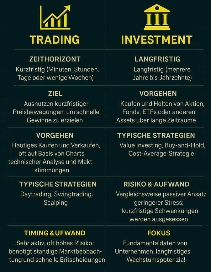 Im Gegensatz zum Investieren, das meist langfristig angelegt ist (z. B. Buy & Hold von ETFs), will ein Trader Preisschwankungen gezielt ausnutzen und schneller Gewinne erzielen.
